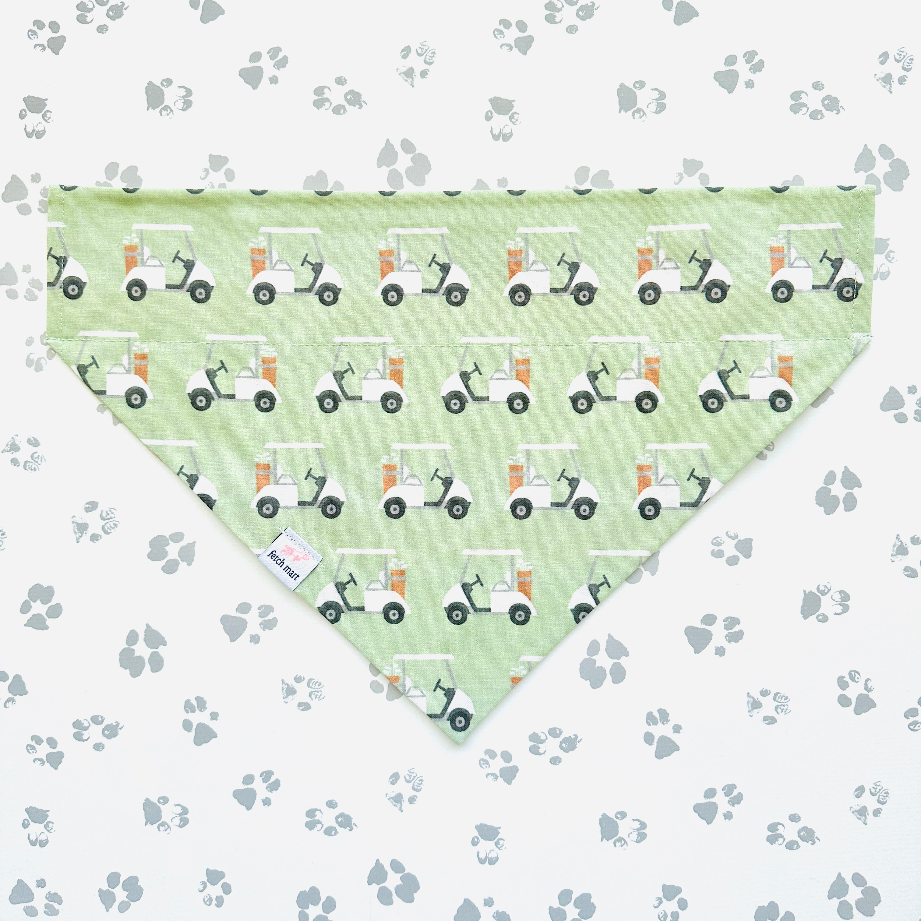 The Golf Carts Bandana is made with 100% cotton fabric. Slip on bandanas stay put and allow you to access the d-ring on your dogs collar. Tie on bandanas tie around your pets neck.
