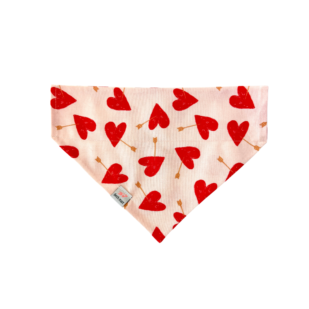 The Cupid's Arrow Bandana is made with 100% cotton fabric. Slip on bandanas stay put and allow you to access the d-ring on your dogs collar. Tie on bandanas tie around your pets neck
