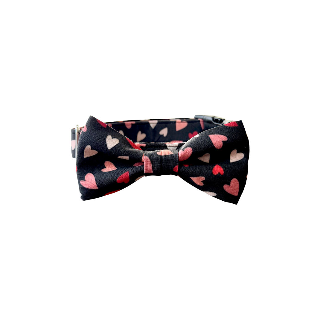 The Lovestruck Bow Tie is made with 100% cotton fabric, and reinforced with fabric stabilizer. It features two velcro straps that make it easy to attach to any collar.