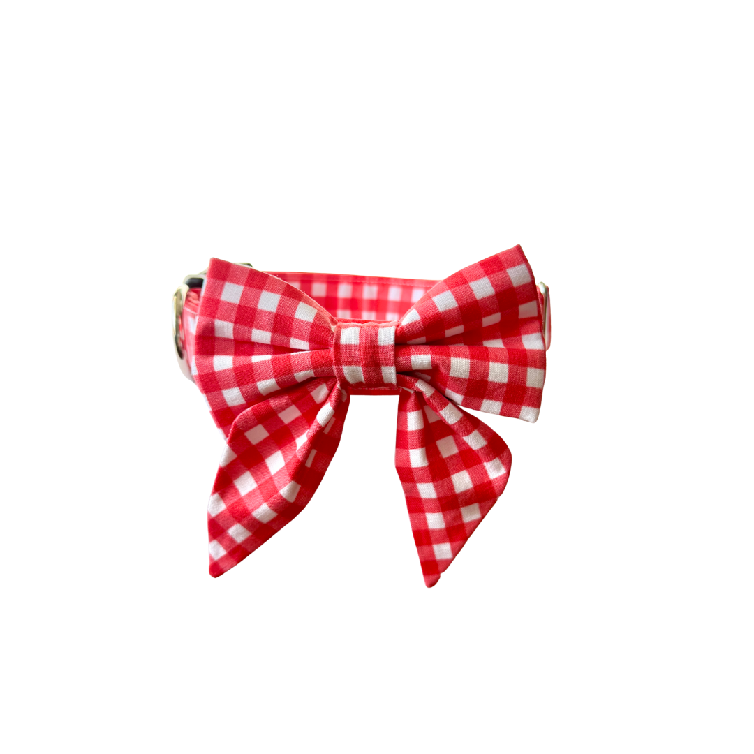 The Red Gingham Sailor Bow is made with 100% cotton fabric, and reinforced with fabric stabilizer. It features two velcro straps that make it easy to attach to any collar.