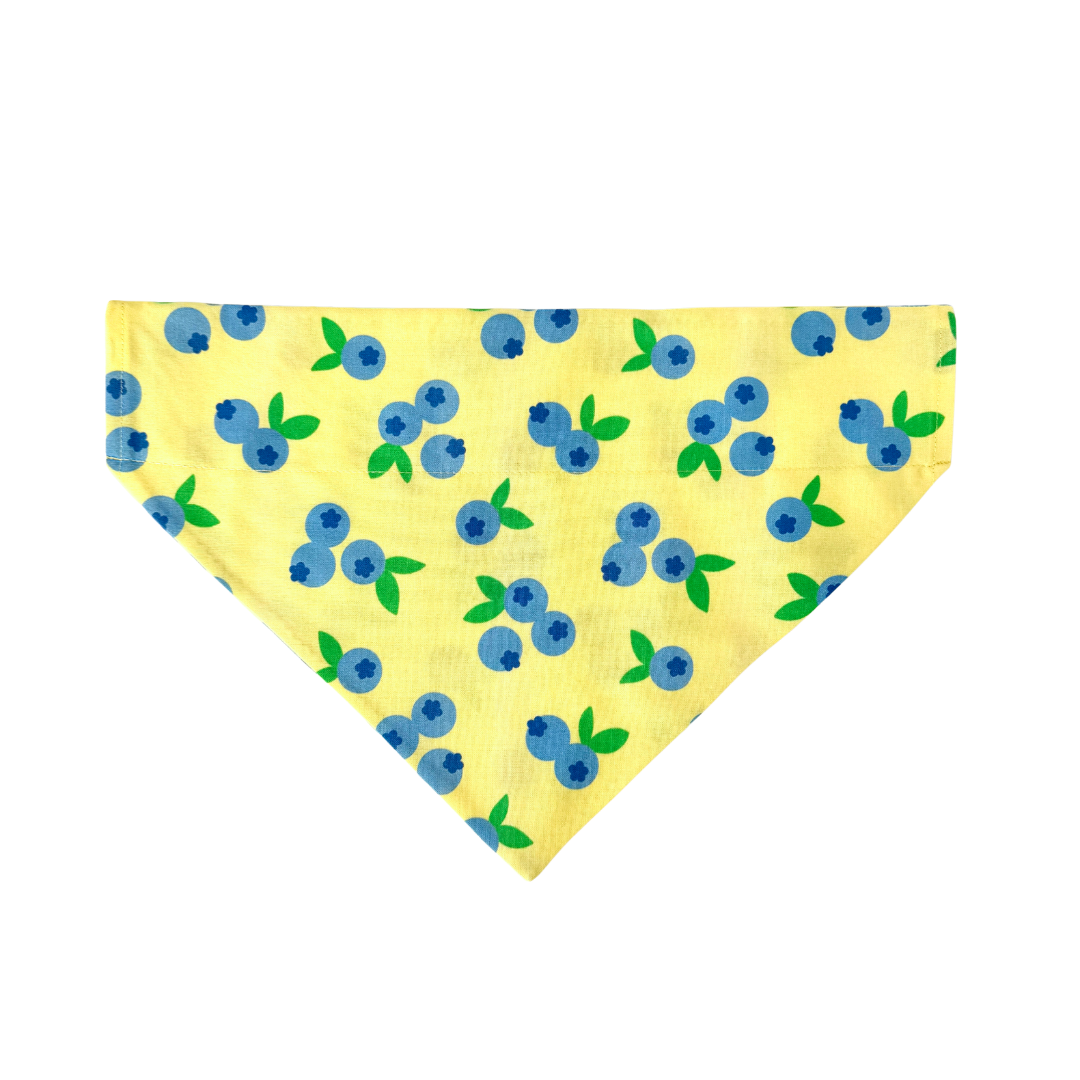 The Blueberries Bandana is made with 100% cotton fabric. Slip on bandanas stay put and allow you to access the d-ring on your dogs collar. Tie on bandanas tie around your pets neck
