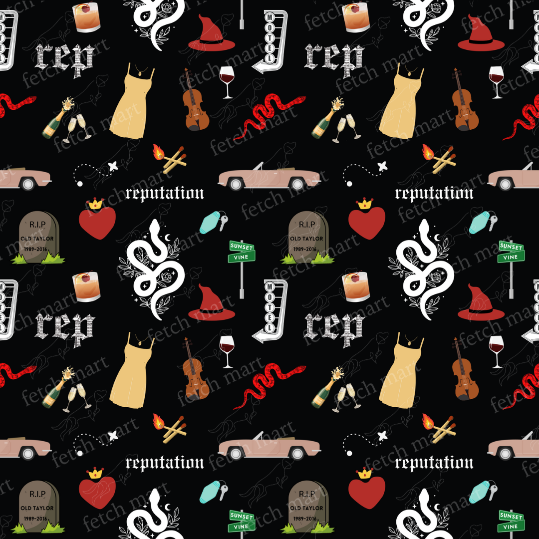 The Reputation Era Bandana is made with 100% cotton fabric. Designed by Fetch Mart, this one of a kind bandana features designs that represent the Reputation era.