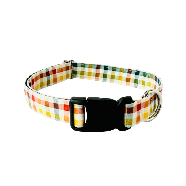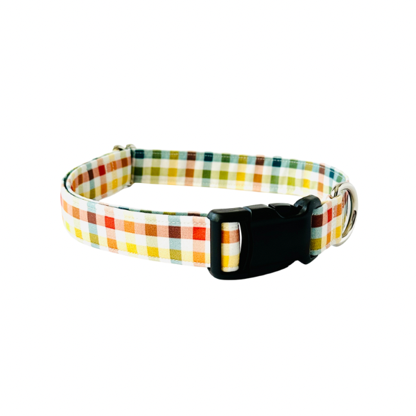 The Autumn Rainbow Gingham Collar is made with 100% cotton fabric and reinforced with mold proof webbing. Available in a Classic or Martingale style collar.