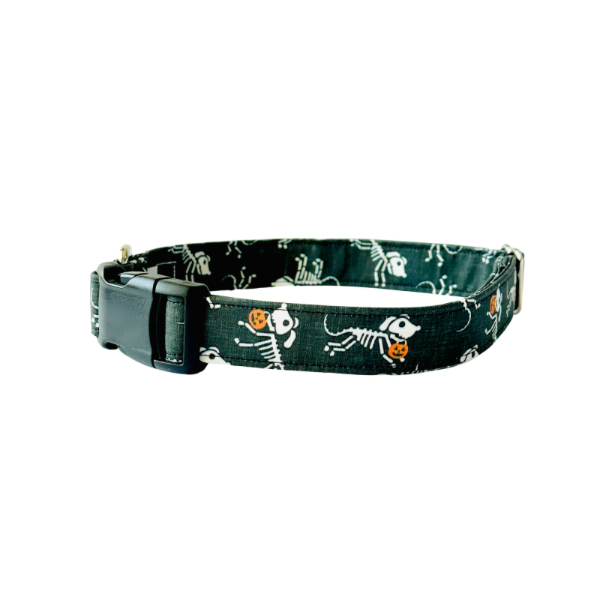 The Skeleton Dogs Collar is made with 100% cotton fabric and reinforced with mold proof webbing. Available in a Classic or Martingale style collar.
