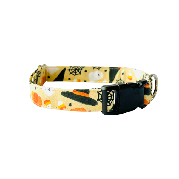 The Spooky Season Collar is made with 100% cotton fabric and reinforced with mold proof webbing. Available in a Classic or Martingale style collar.